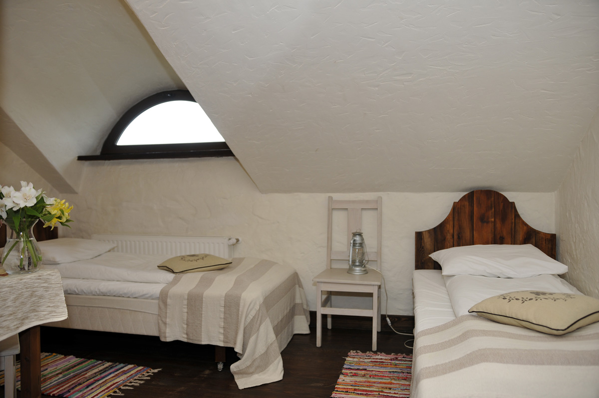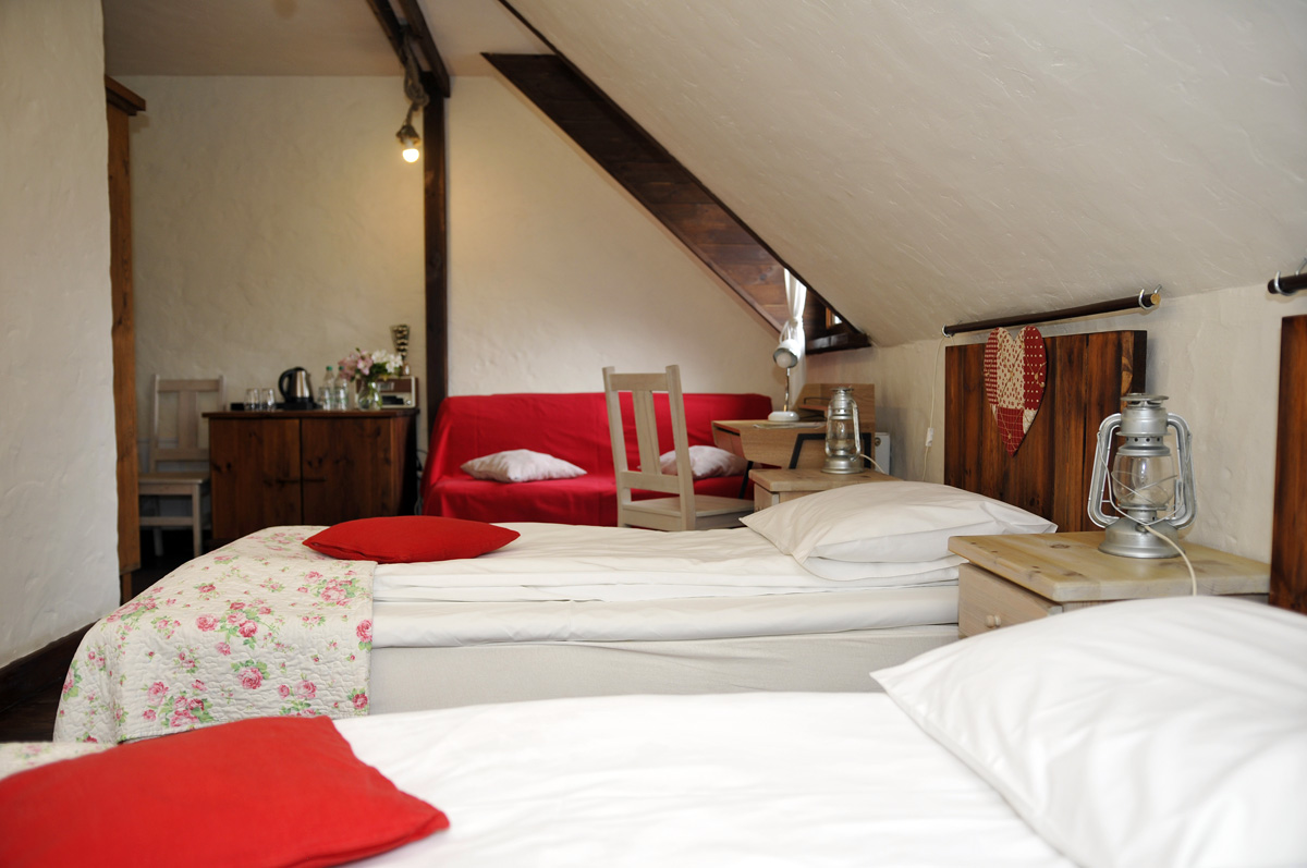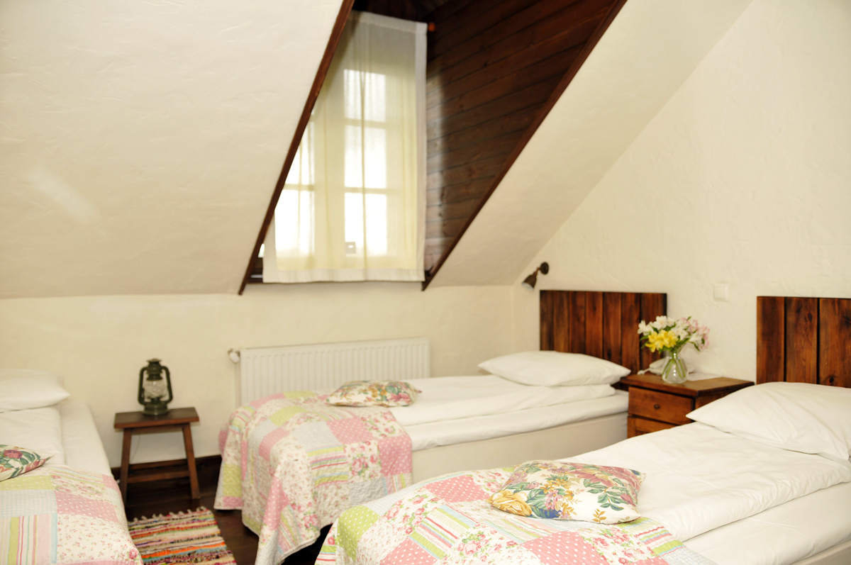 Dwanaście miejsc noclegowych w 6 niezależnych pokojach dwuosobowych. Łazienka z prysznicem i wanną w każdym pokoju.